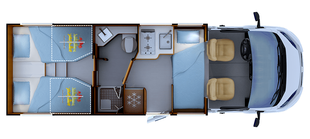 Le seul profilé compact avec lits jumeaux, banquette face-face et douche séparée