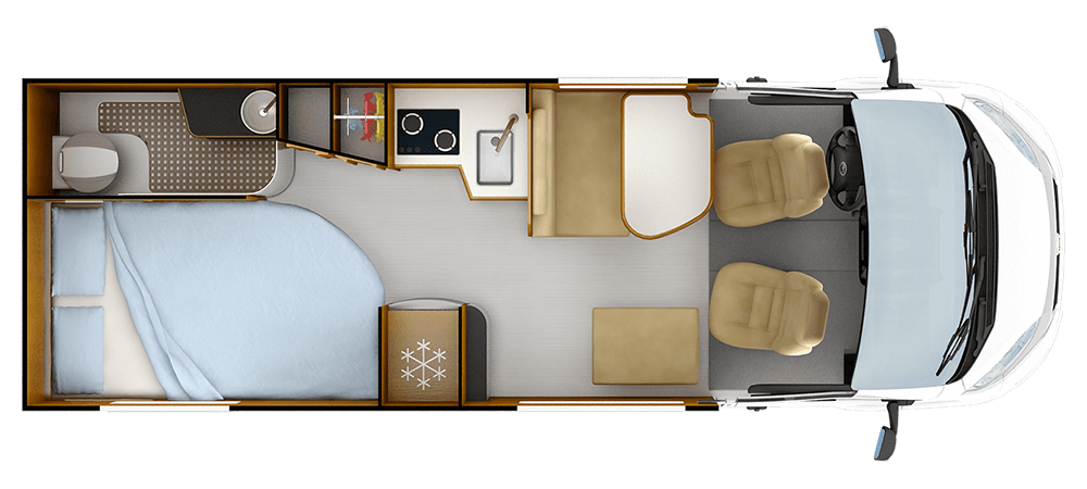 • Rangement sous bloc cuisine avec tiroirs pour couverts et casseroliers, revêtement intérieur PVC haute résistance, verrouillage centralisé électrique et alarme au démarrage moteur en cas de non-verrouillage