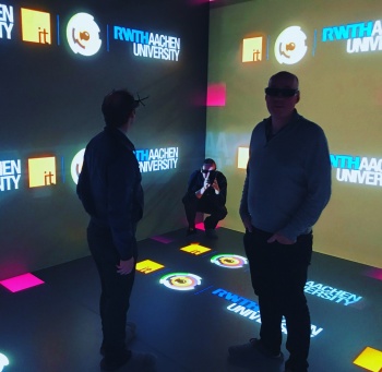 Nous avons rendez-vous à l’Université d’Aix-La-Chapelle avec le professeur Torsten pour visiter le plus grand Cave de réalité virtuelle d’Europe : 5,5m x 5,5m, 4 projecteurs sur chaque face, construit sur un immense plateau de verre 5 mètres au-dessus du sol (avec 4 projecteurs en dessous) et plusieurs enceintes sont au plafond ! L'expérience était vraiment perturbante. Nous avons essayé 2 démos. Dans la première, le professeur et son équipe ont recréé leur labo en VR, et nous l’avons donc visité. Pour la seconde, il s’agit d’un simulateur d’air au-dessus d’une ville, permettant de voir la circulation des différents flux et comment ils évoluent entre les différents bâtiments. C’est incroyable de pouvoir partager la même expérience, en même temps, avec autant de personnes que la taille de la Cave le permet… Nous quittons Aachen (Aix-La-Chapelle en Allemand) relativement tôt afin de rejoindre Düsseldorf le plus vite possible.