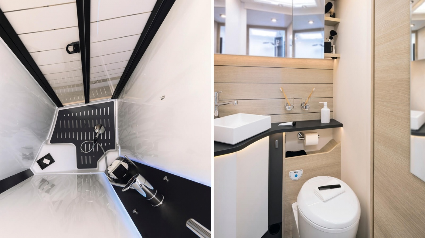 Même sur la route, le confort reste une priorité. Chaque salle de bain Rapido est conçue pour offrir une hygiène impeccable dans un espace réduit. Les douches ergonomiques, les lavabos optimisés et les WC assurent praticité et efficacité.