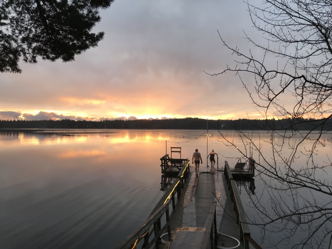 L’endroit où nous sommes se divise en plusieurs parties. Il y a d’abord 3 saunas différents, les deux premiers sont électriques, c’est-à-dire que les pierres brulantes sont chauffées grâce à un système électrique, contrairement au dernier qui est avec un vrai poêle à bois qu’il faut alimenter en bûches. Il y a également un bassin d’eau chaude, et pour finir ce qui me faisait peur depuis le début : Le lac avec l’eau à 4°C. Le principe est de choisir un premier sauna, se chauffer pendant 15/20 minutes, avant de se jeter dans le lac pour refroidir le corps, et booster la circulation du sang ; avant d’aller au prochain sauna. Charmant n’est-ce pas ?