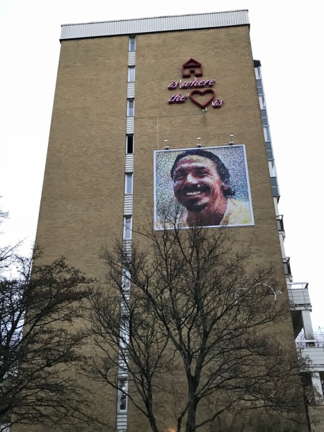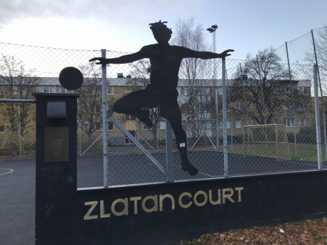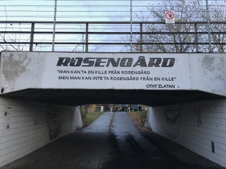 Nous visitons donc l’ancien quartier de Zlatan. Nous sommes « accueillis » par son portrait géant sur la façade du premier building. Mégalomaniaque ? Pas du tout, il veille sur eux depuis là-haut… Même s’il n’est pas mort. Gauthier insiste pour aller voir le fameux pont avec l’inscription : « On peut sortir l’homme du Ghetto, mais le Ghetto ne quitte jamais l’homme », enfin quelque chose comme ça. Nous avons trouvé le pont. Nous avons trouvé la citation. En suédois. Impossible de savoir si c’est la bonne ou si cela signifie complètement autre chose, mais pour notre satisfaction personnelle nous dirons que oui, c’est bien celle-ci.